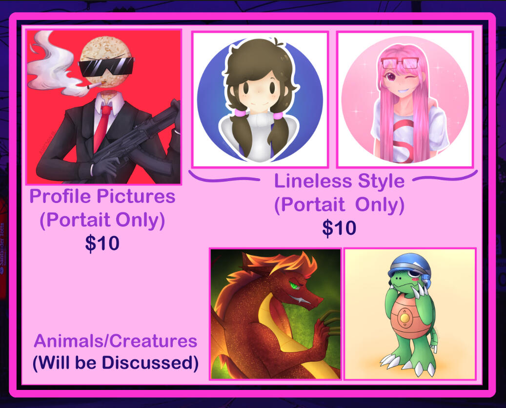 Other Commissions: If you want drawings of yourself, pets, or anything fan art, then please provide references. References for game characters will not be needed unless you want that character customized differently from their default skin. Overall, just always give me pictures of what you want something to look like, and it will help direct me to your desired piece.
